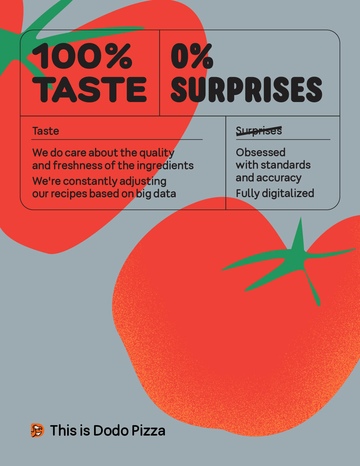 Вы могли заметить, что это слово довольно часто встречается в брендбуке. Это потому что мы и в работе постоянно его используем. Додо Пицца — это сообщество гиков, и речь не только о разработчиках. Конечно, всё это ради качества. Но если посмотреть глубже, мы заморачиваемся ради себя — ради кайфа от работы и удовлетворения от результата. Вот такие мы люди.